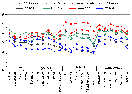 The lack of variation in traits other than solidarity may be due to relatively consistent perceived status of English speakers.